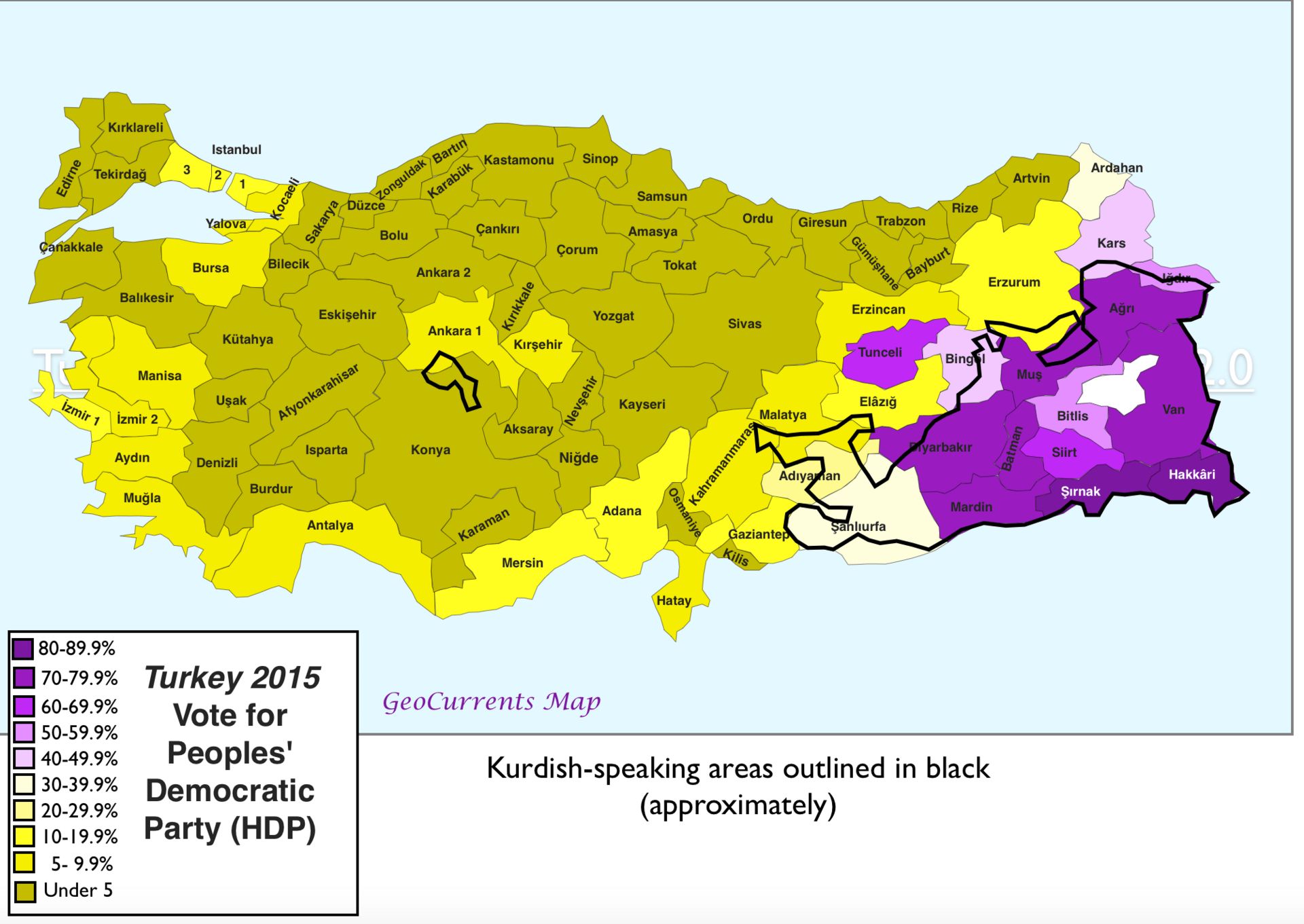 Map of Turkey showing 2015 voting percentages for the pro-Kurdish Peoples' Democratic Party (HDP)
