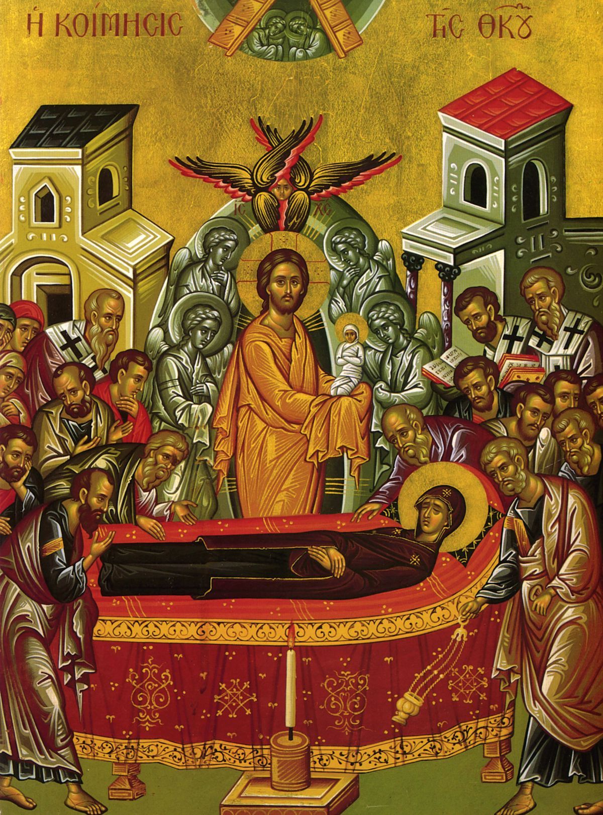 The Mother of God lies upon her funeral bier surrounded by the Holy Apostles and saints, while Christ (center) receives her soul – depicted as a swaddled infant – into heaven