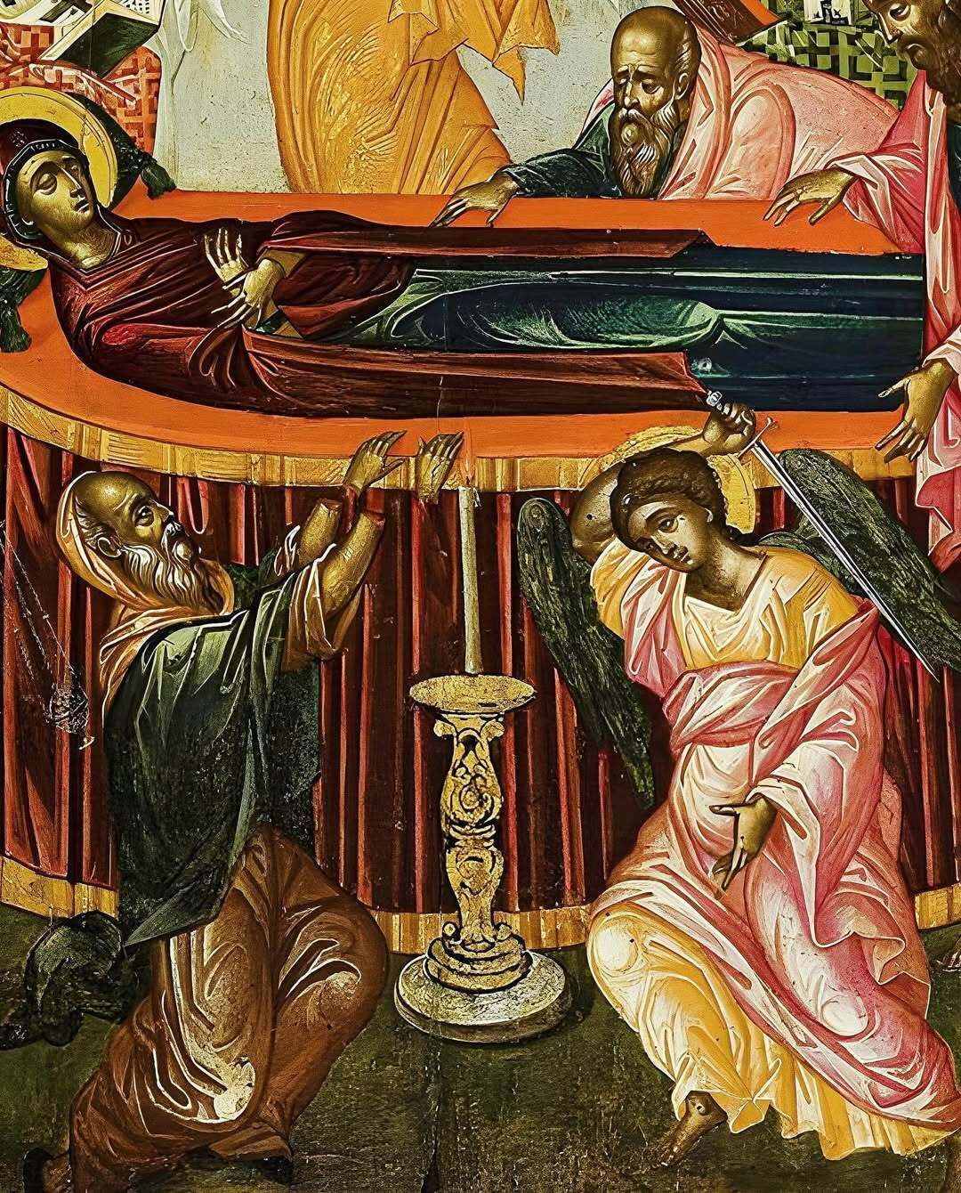 A striking detail in some Dormition icons is a figure, a Jewish priest named Jephonias, shown being restrained or whose hands are being severed by an angel as he tried to touch the holy bier. This comes from an ancient story that a man irreverently rushed to push over the Virgin’s body, and an angel defended her, later healing the man when he repented. This dramatic vignette (found in certain iconographic versions) teaches the sacredness of the Theotokos’ body and the need for pious respect before the mysteries of God. It also highlights that Dormition, like the Resurrection, was witnessed only by believers.
